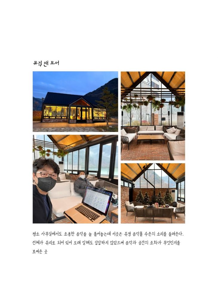 워케이션의 한축은 일입니다. 그러다 보니 일정시간은 일에 집중해야 합니다. 업무가 원할하게 진행되기 위해서는 인터넷, 개인업무 공간, 회의공간 등이 필요하죠. 파크로쉬는 어디서나 무선 인터넷이 빵빵 터져서 좋았습니다. 일할 수 있는 공간도 라이브러리, 레스토랑, 뮤직룸 등 그때 그때 기분에 맞춰 바꿔가며 일할 수 있었습니다. 다만 이 공간들이 노트북을 놓고 일하는 공간으로 설계된게 아니다 보니 책상이 낮다는게 불편했습니다. 다행히 높이 조절이 가능한 노트북 거치대를 갖고 있어서 멋진 공간에서 편하게 일할 수 있었습니다.