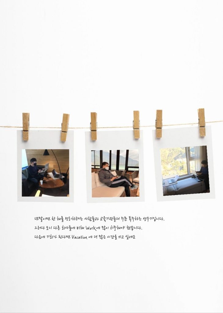연말은 한해를 마무리 하는 시기입니다. 한해를 마무리하고 내년을 계획하는 시기이지만 안타깝게 저희는 성수기입니다. 그러다 보니 여유를 가지고 일을 할 수 없었습니다. 낮에 유연하게 일하기에는 업무량이 많아서 가끔은 늦게까지 일을 했어야 했던게 아쉽습니다.