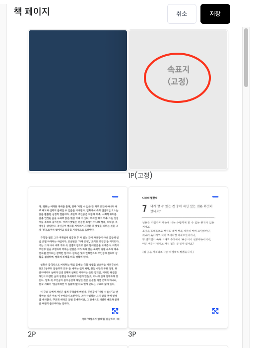 책 '편집'에 들어가면 1페이지는 속표지(고정)로 되어 있는것을 볼 수 있는데요,