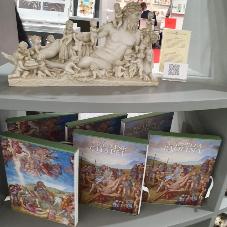다음으로 특이했던 출판사를 보여드릴게요. 여기는 이탈리아에 있는 박물관에서 관련 책자를 만드는 곳인 것 같아요. 석상과 함께 미술 작품, 큰 아트북 같은 것들이 전시되어 있어 찍어봤어요.