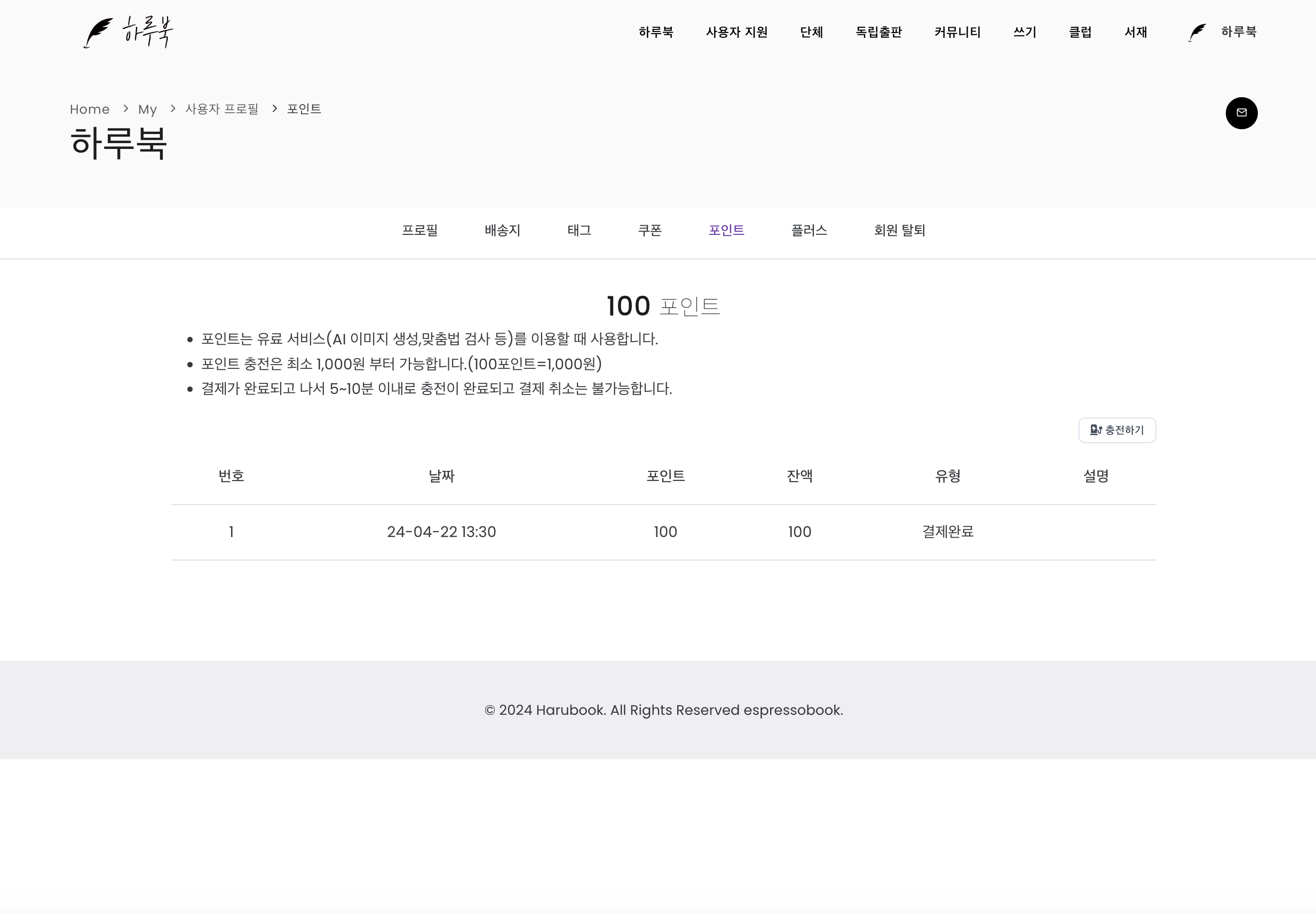하루북 포인트 조회, 충전하기
