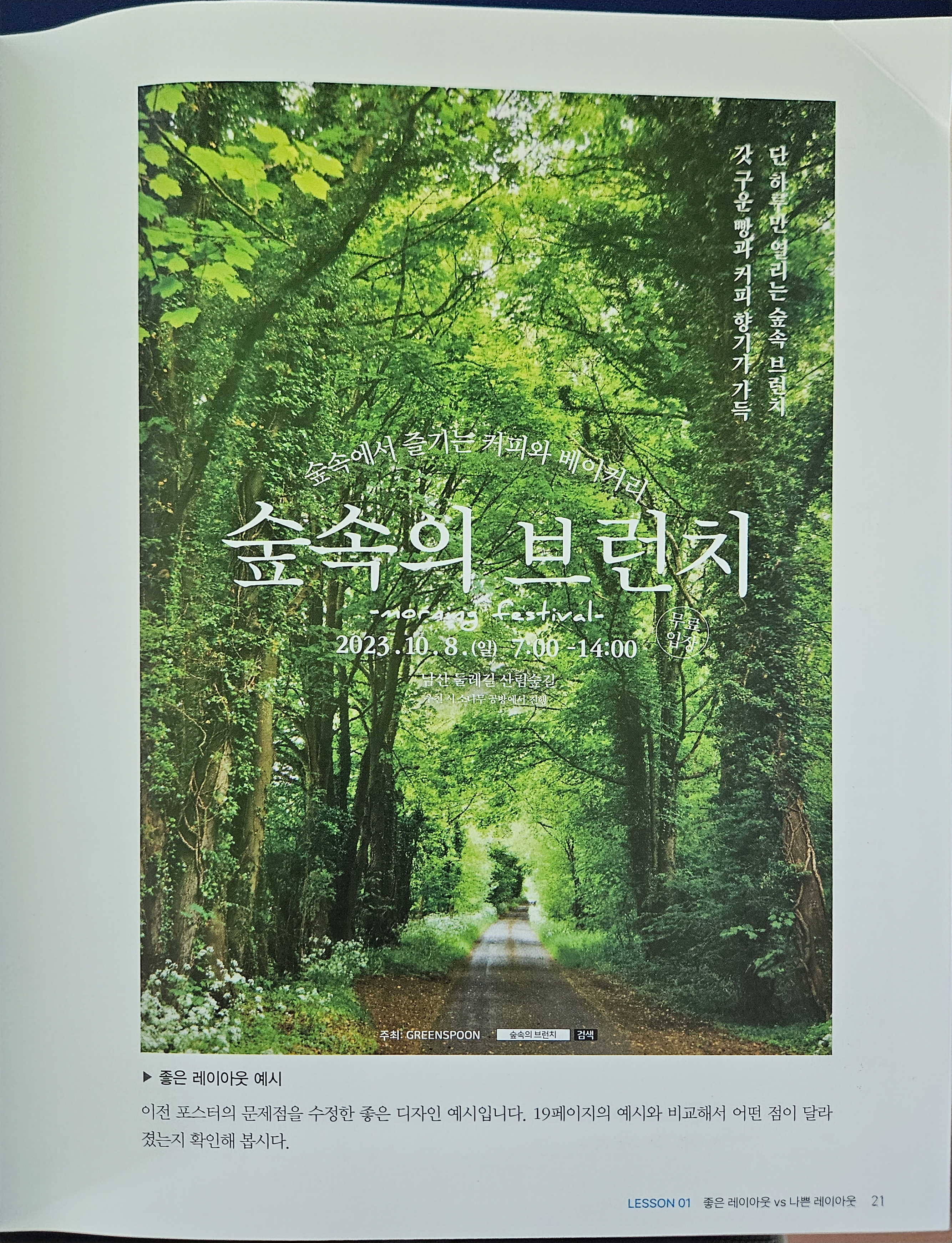 위 사진 같이 전문 디자이너들이 디자인한 포스터나 작품을 소개하고 각 작품에서 사용된 레이아웃 기법도 함께 설명해주고 있습니다.