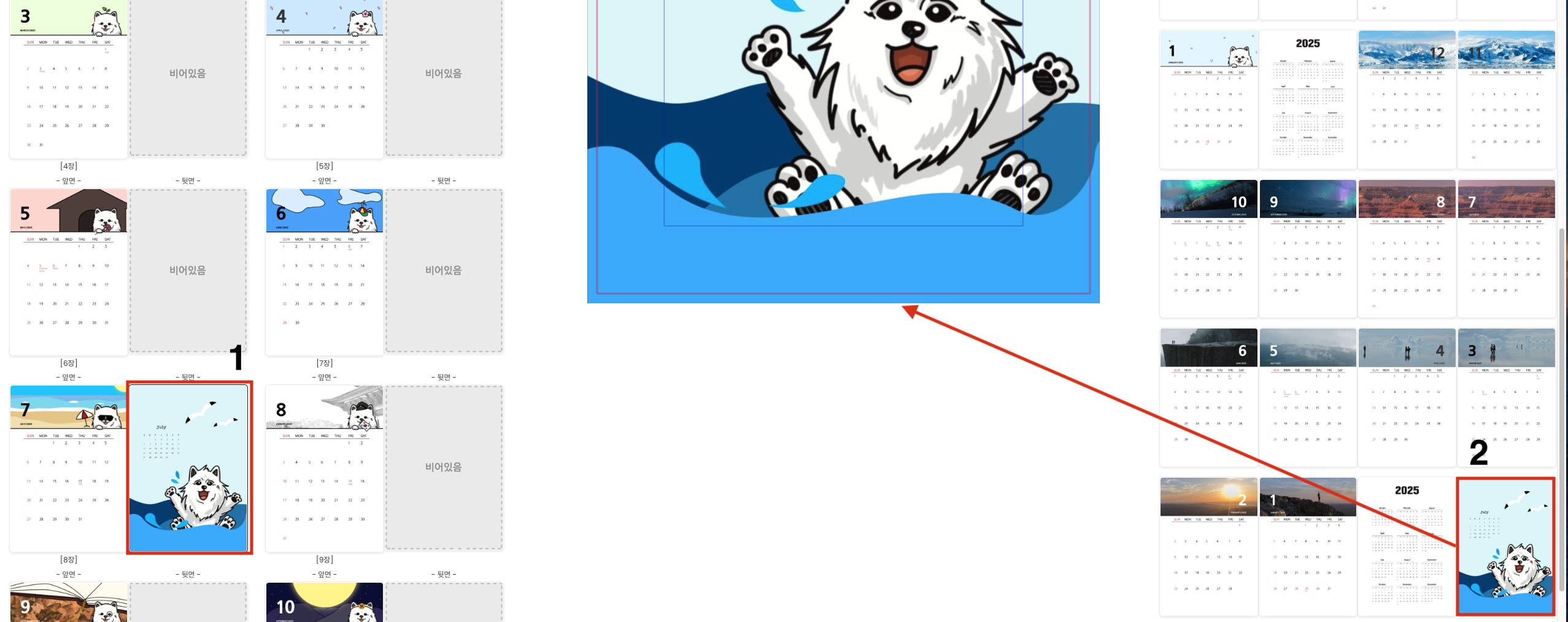 [편집]에서 비어있는 7월의 뒷면을 선택하고 페이지를 넣어줬습니다.