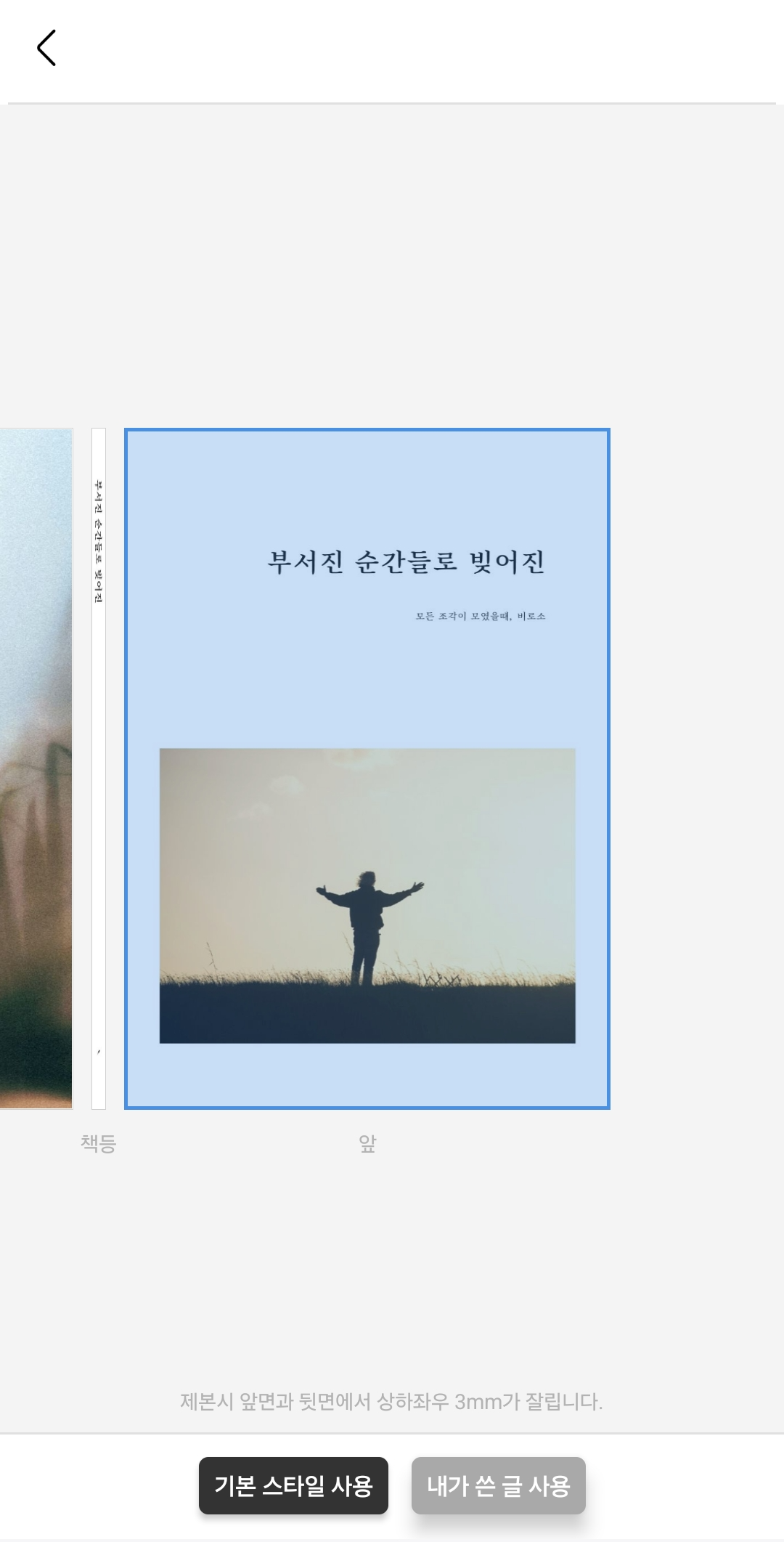 앞표지를 선택하면 아래 [기본 스타일 사용][내가 쓴 글 사용]이 보입니다.