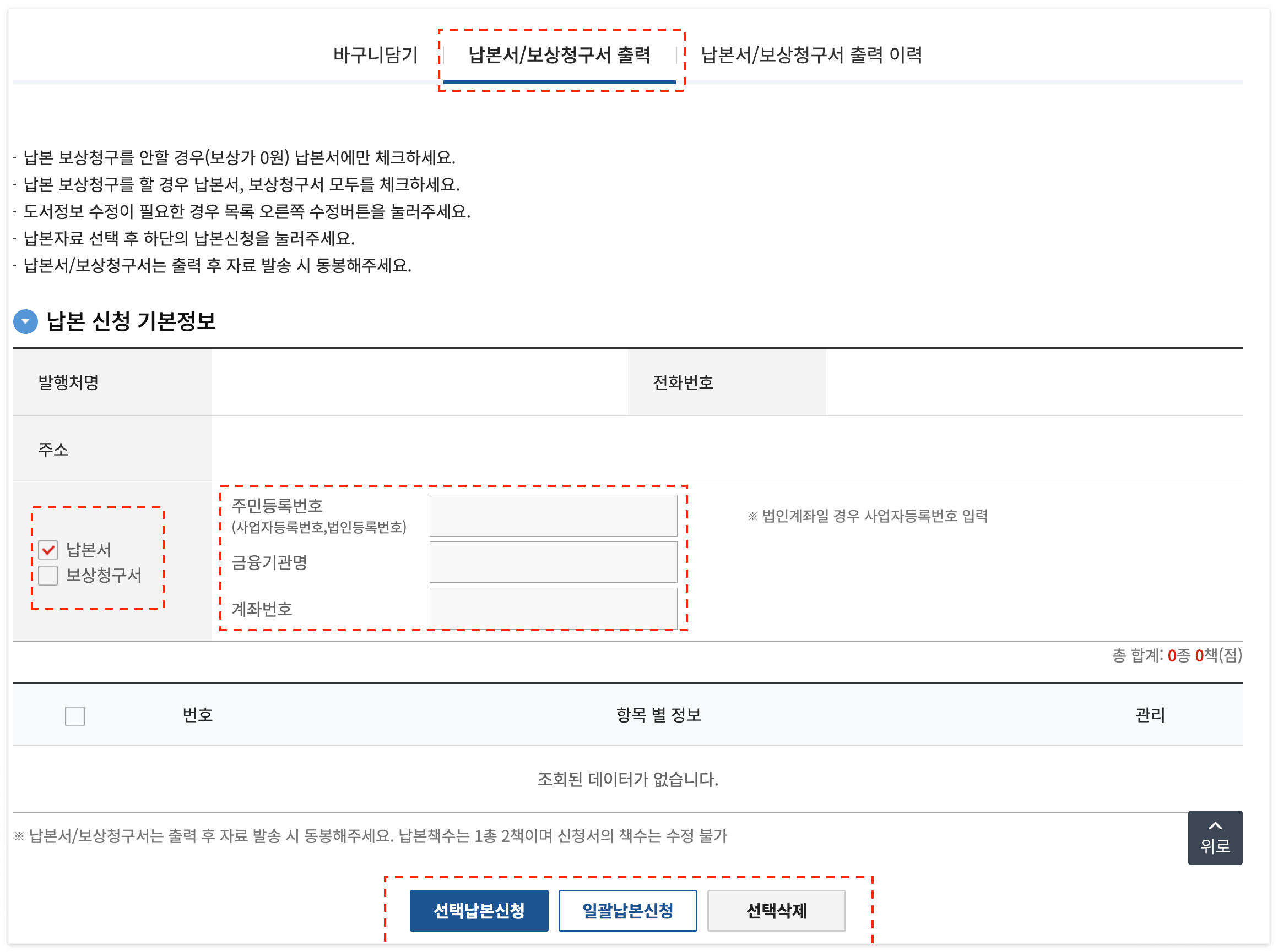 [납본서/보상청구서 출력 이력]을 통해 납본서를 출력할 수 있습니다.