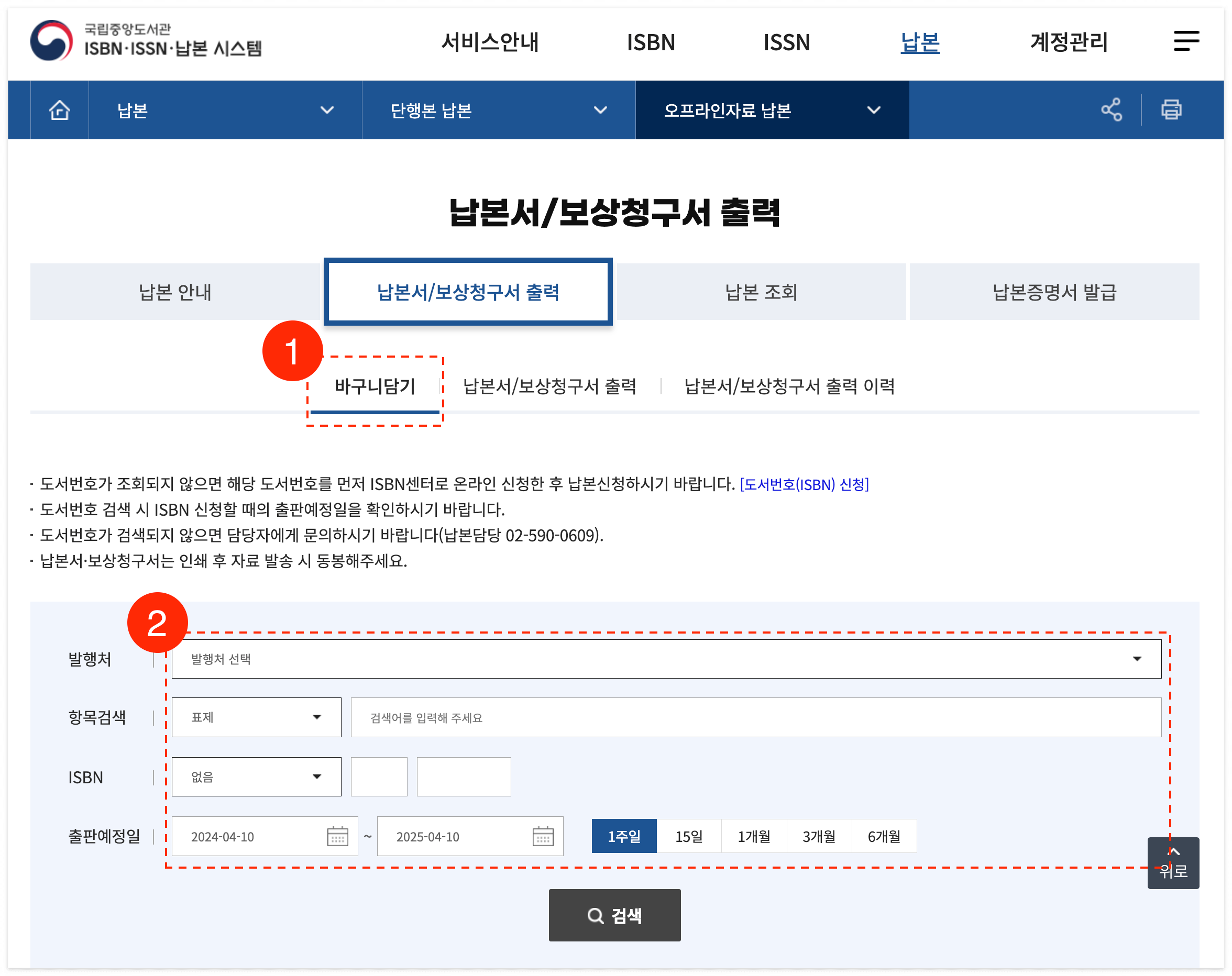 납본할 책이 여러 권이면 여러개를 검색 해 바구니에 담을 수 있습니다.