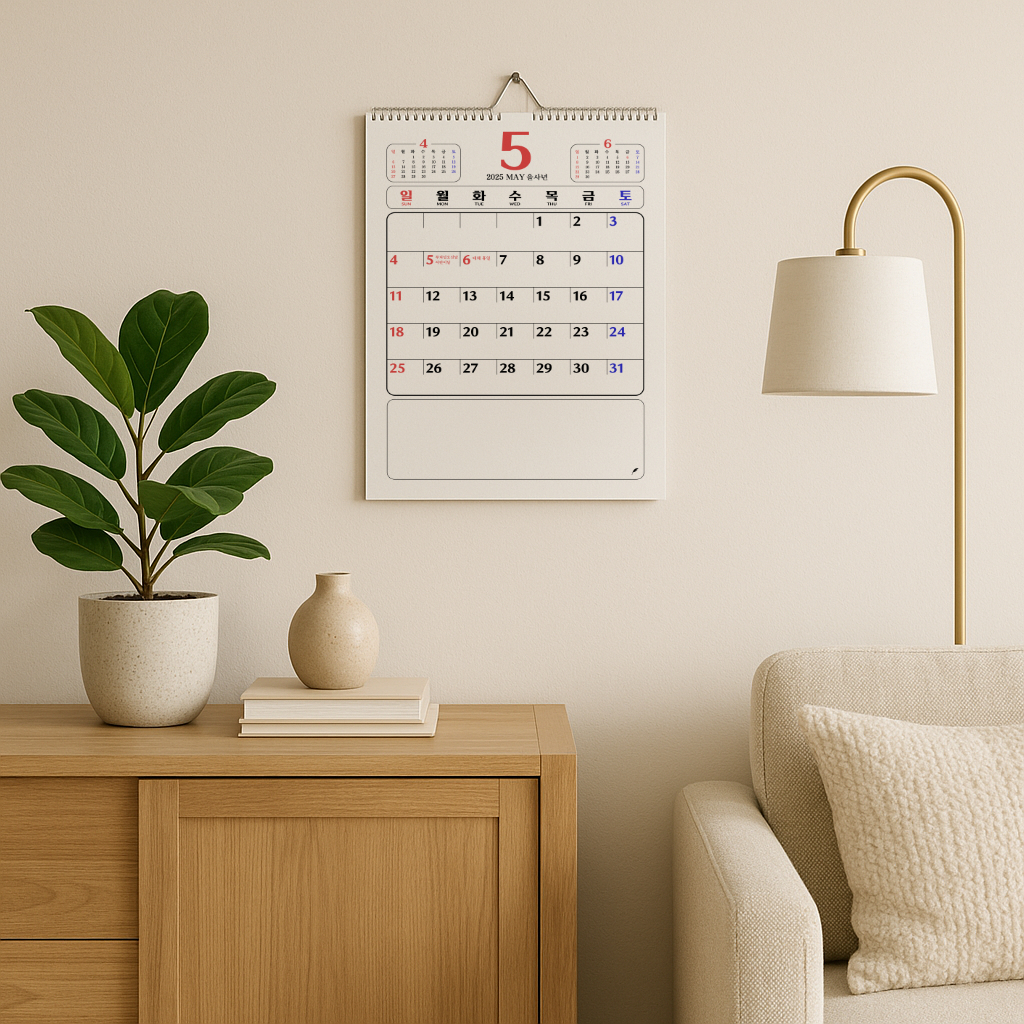 벽걸이 달력 크기는 가로x세로 36x50cm로 벽걸이 달력중에는 작은 크기입니다. 너무 크지 않아 방에 걸어두기에 적당하고 어디에나 잘 어울립니다.