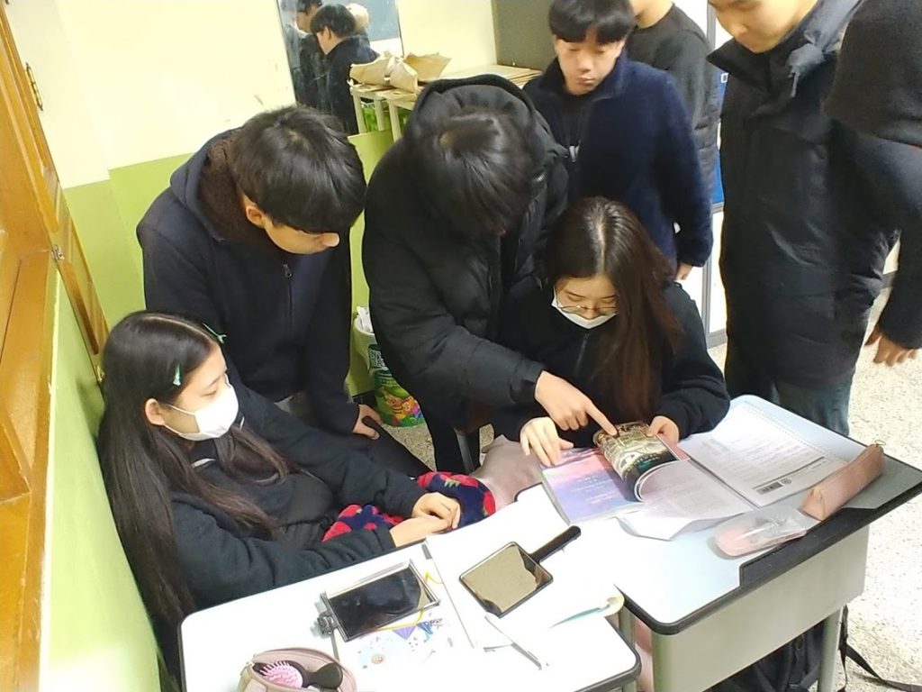 “에이~ 웃기지 마, 말도 안 돼. 진짜야?? 정말이네? 이름도 써 있네? 이거 얘가 썼대.”라며 안 믿다가 서로 모여서 구경하는 학생들.