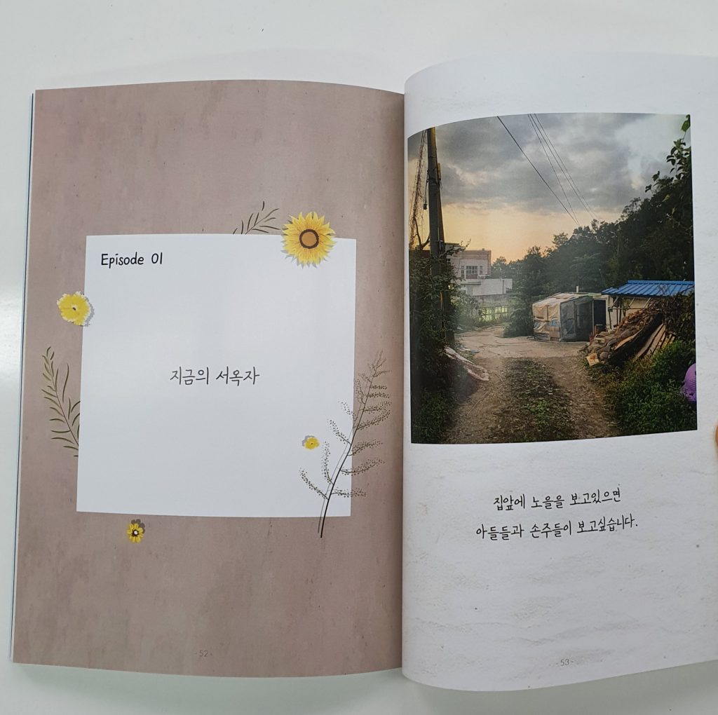 민솔: 처음에 복지관에서 어르신을 한번 만나고 그 다음주부터 일주일에 한 번씩 5번 정도 할머니 집을 찾아가서 여러 얘기도 듣고 대화를 했어요. 책에 들어간 사진들은 집에 찾아갔을 때 앨범에서 찍은 사진이에요. 얘기한 것을 녹음해서 공강 시간 마다 어떻게 구성할지 얘기했어요. 그렇게 녹음된 것을 타이핑해서 정리했고 하루북으로 책을 만들었습니다.