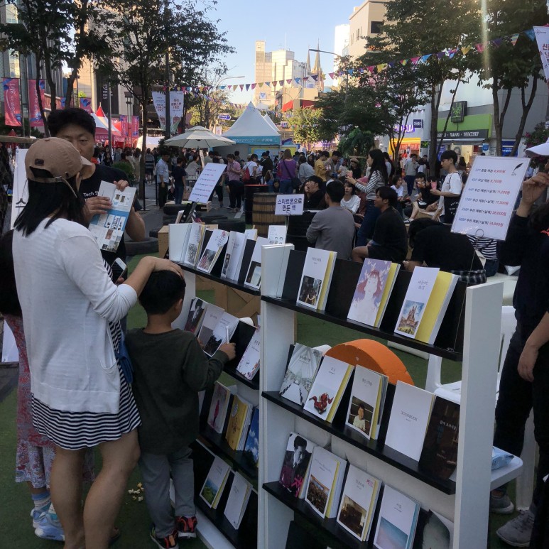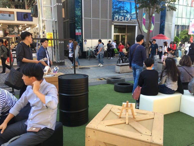 하루북 부스는 유플렉스 바로 앞 쪽에 있었는데요, 전시된 책을 구경하면서 지나가는 분들이 쉴 수 있도록 편안한 쉼터가 준비되어 있었답니다.