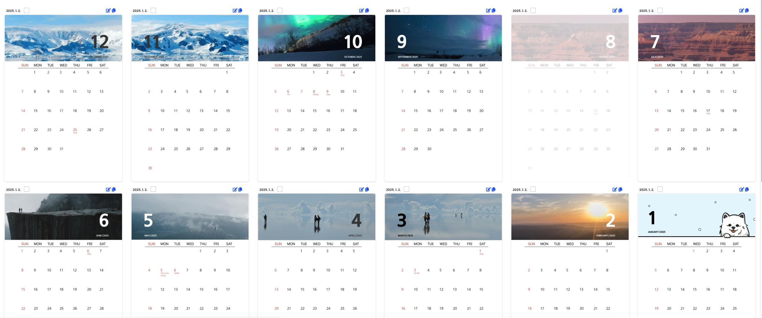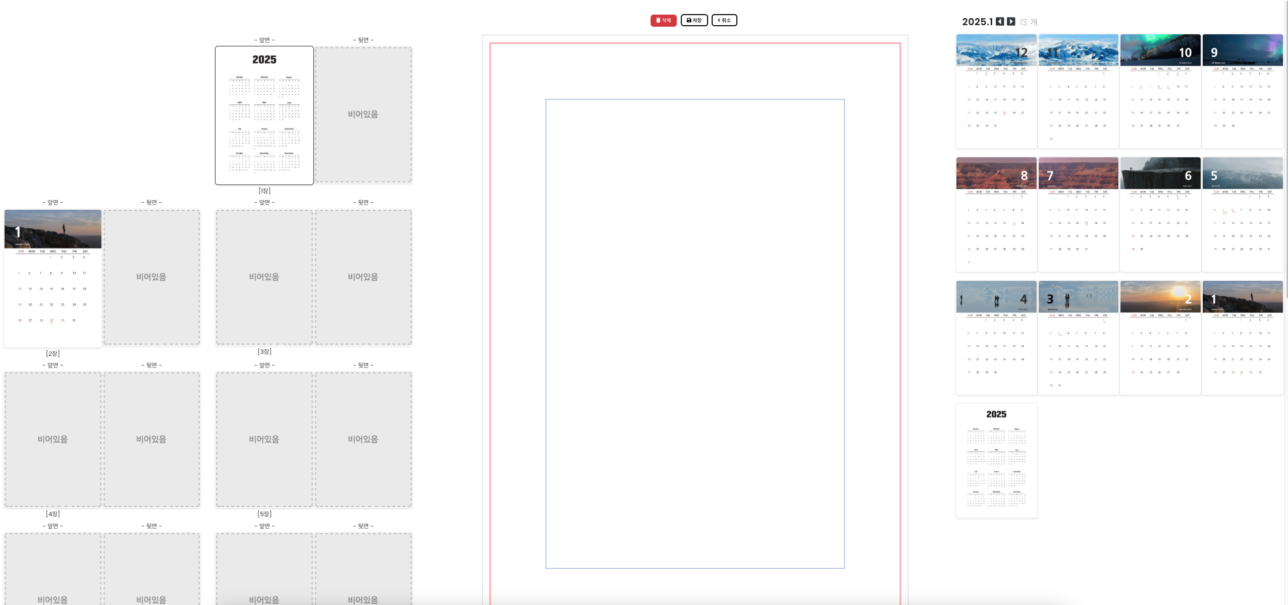 달력의 앞면은 이미지 달력 템플릿이 적용된 페이지가 자동으로 생성되어 자리를 차지하고 있습니다.ㅎ