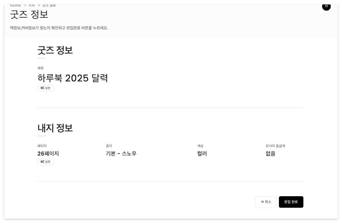사양을 확인해주시고 편집완료를 누릅니다.