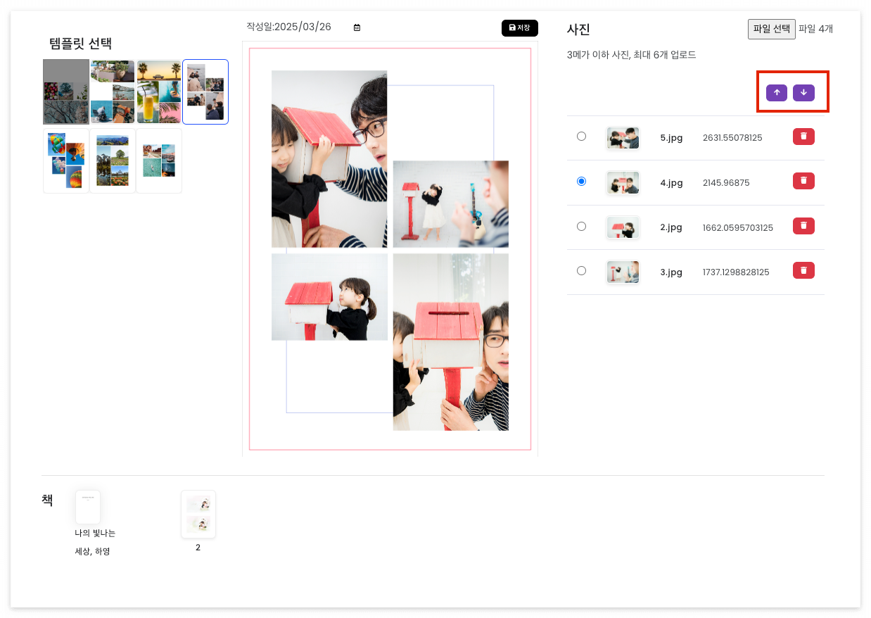 그럴 때는 4번 이미지를 선택해서 보라색 버튼을 눌러 2번 이미지랑 순서를 변경하면 됩니다.