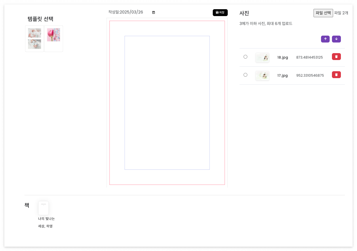 사진은 한 페이지에 최대 6개까지 넣을 수 있고, 여러 개 동시에 선택 가능합니다.