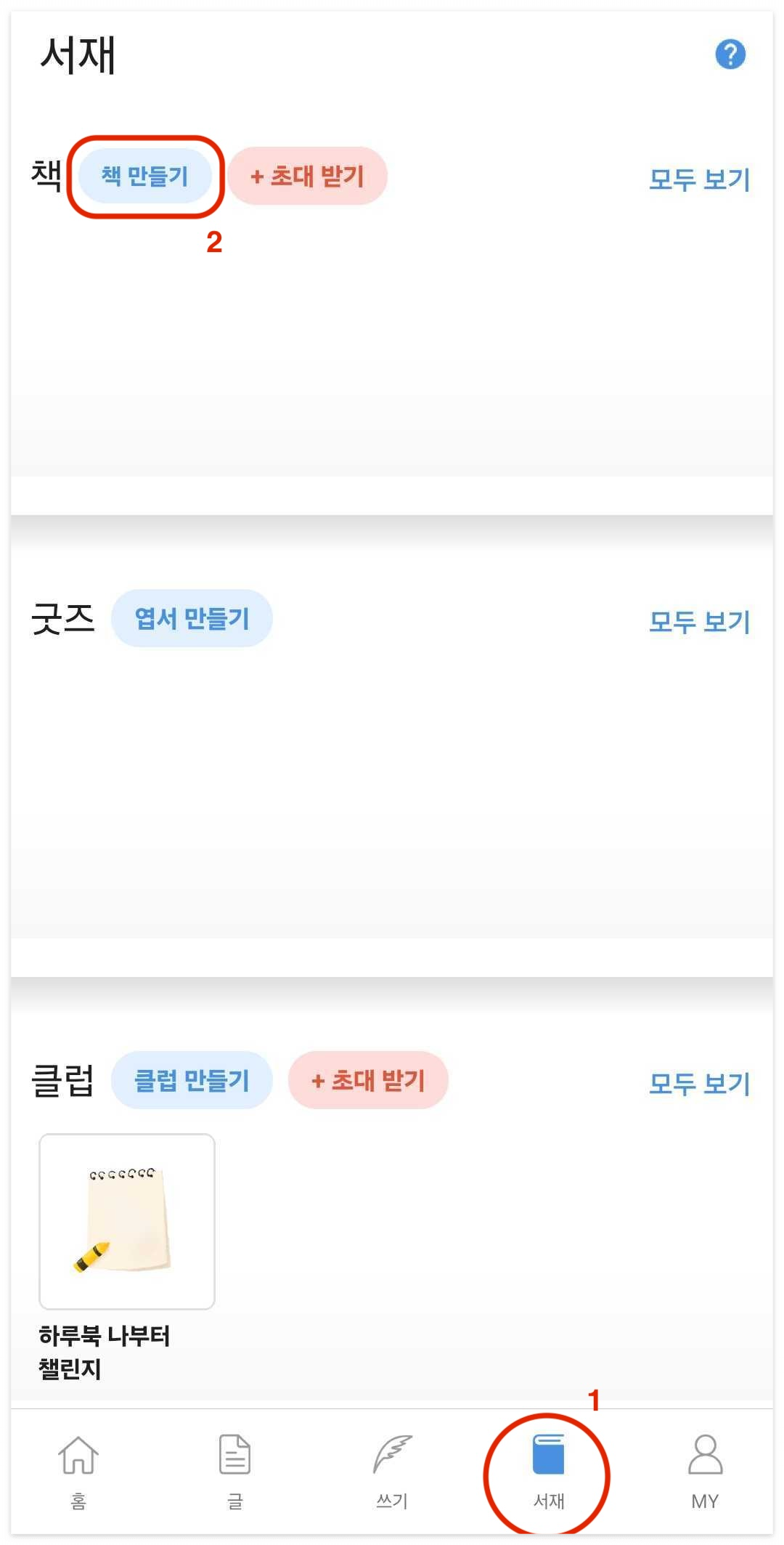하루북 앱 하단 메뉴에서 [서재]를 누른 후,