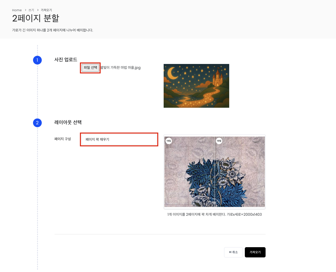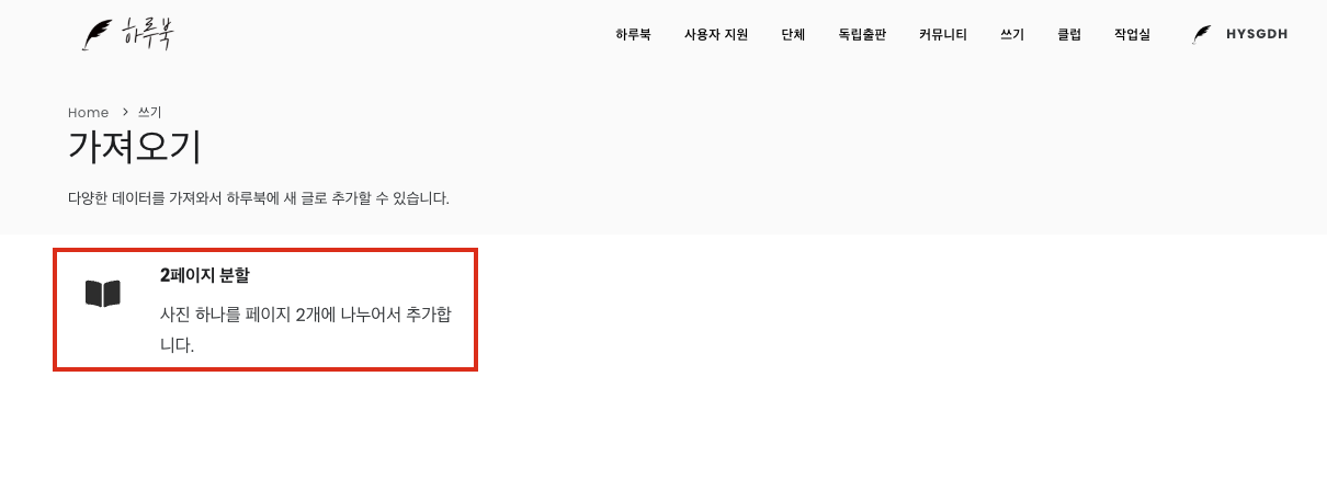 [쓰기 > 글]에서 오른쪽 - 왼쪽 페이지를 분할 하기 보다는 하루북 웹에서 이미지를 2페이지로 분할 해주는 기능을 사용하세요.