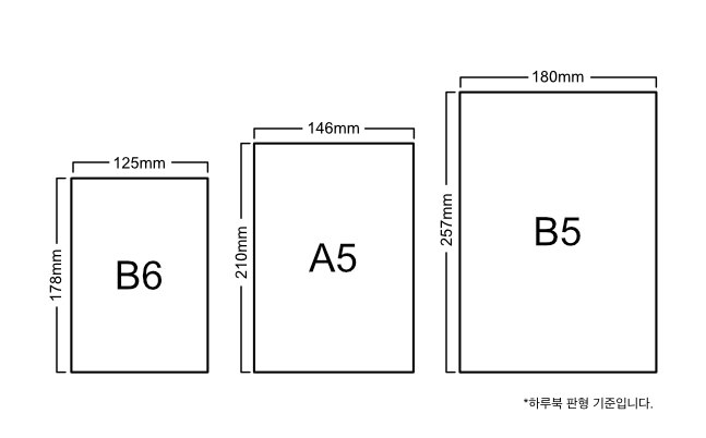 하루북에서는 B6,A5,B5 판형을 옵션으로 선택할 수 있습니다.