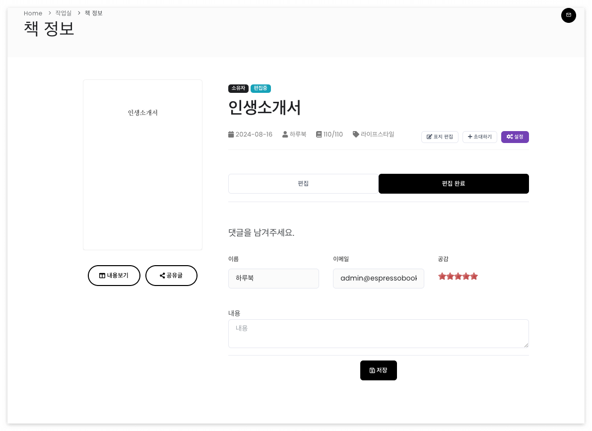 책을 먼저 만들고 '글'을 하나씩 작성하여 편집할 수 있습니다.