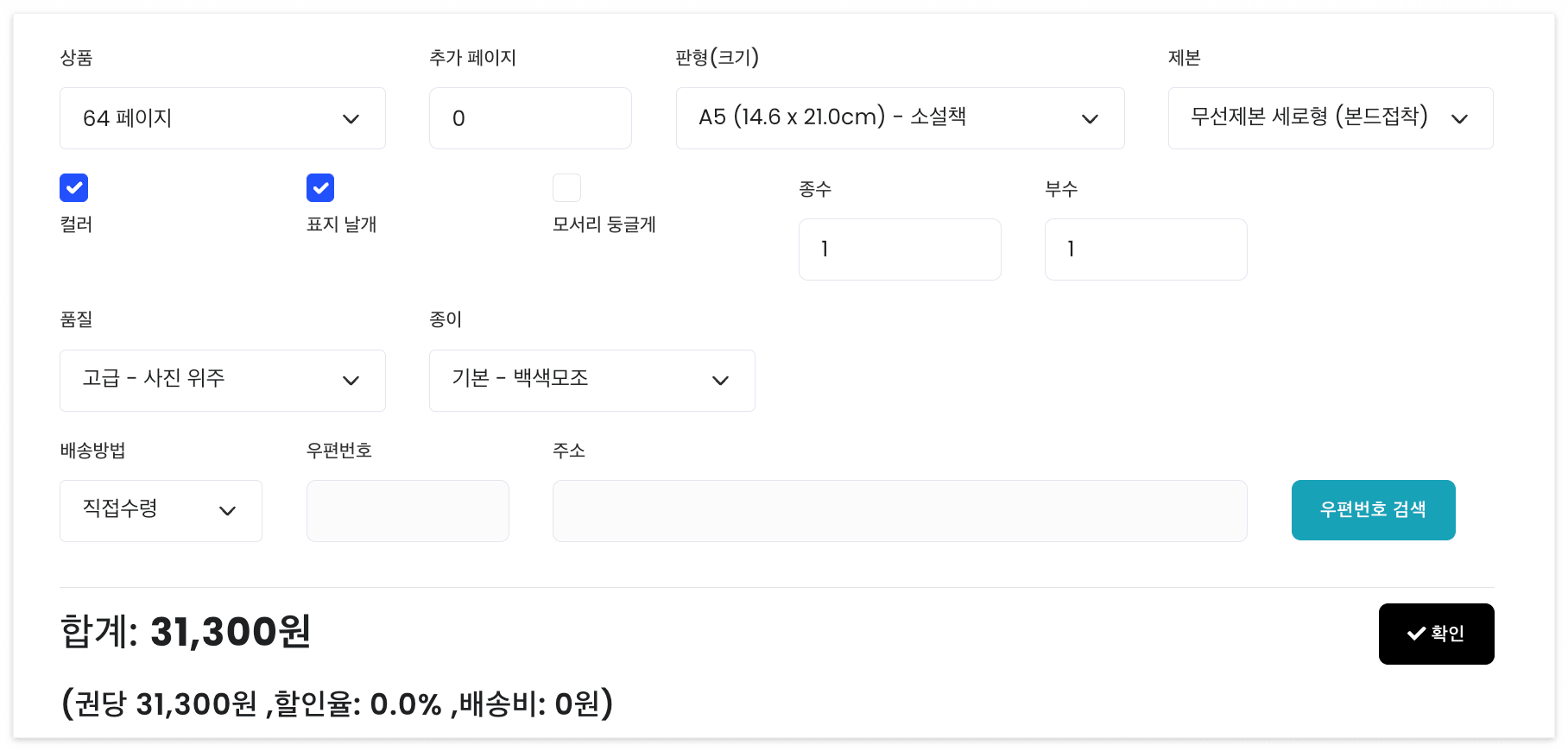 참고로, 해당 옵션은 내지에만 적용되며, 표지는 항상 컬러 인쇄로 진행됩니다.